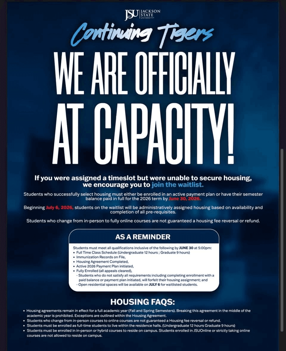 Jackson State University has officially run out of housing for the Fall